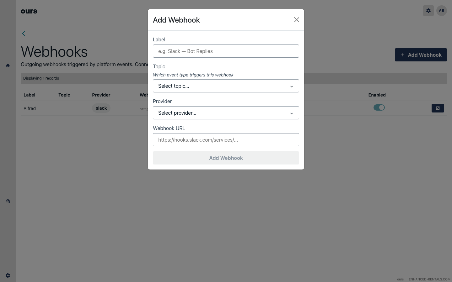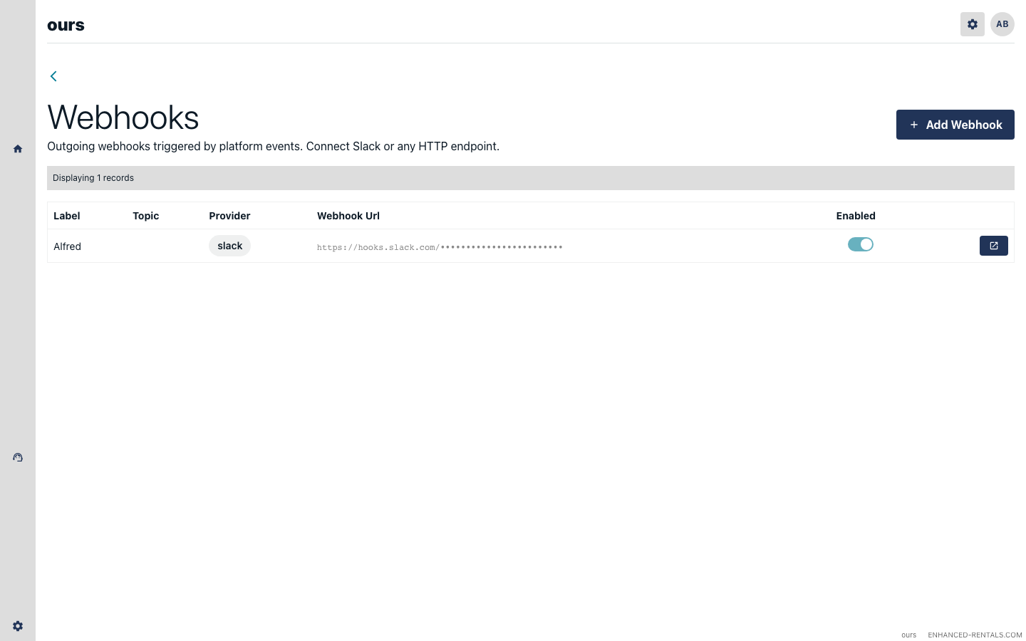 Open the Webhooks page in Enhanced Rentals